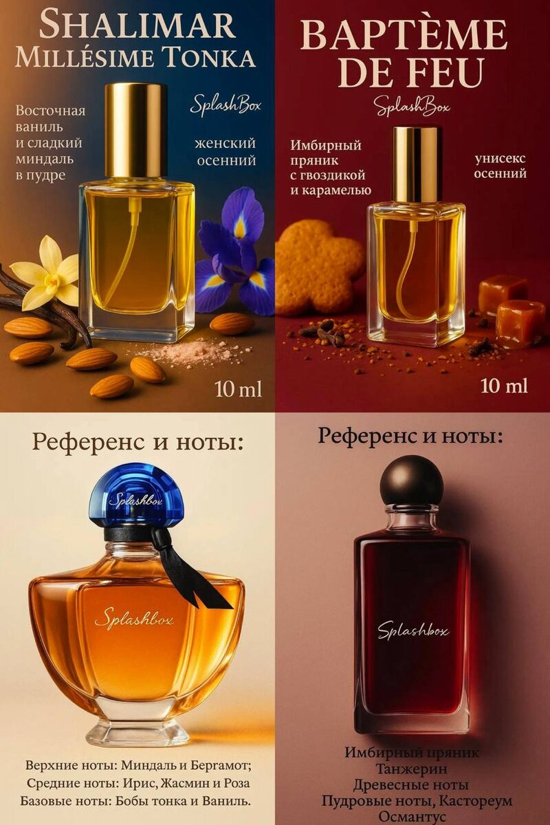 🔸🔸🔸🔸🔸🔸🔸🔸🔸🔸 🤩🤩🤩🤩🤩🤩🤩 🔸🔸🔸🔸🔸🔸🔸🔸🔸🔸 Долгожданные! 🤩 🤩 Shalimar Millesime Tonka - восточная ваниль и сладкий миндаль в пудре 😁 Арт. 568696858 🥶 Арт. 3019270736 Аромат-референс: Shalimar Millésime Tonka Guerlain Пирамида: Верхние ноты: Горький миндаль и Бергамот Средние ноты: Ирис, Жасмин Самбак и Роза Базовые ноты: Бобы тонка и Ваниль 🤩 Bapteme du Feu - имбирный пряник с гвоздикой и карамелью 😁 Арт. 568696800 🥶 Арт. 3019270684 Аромат-референс: Baptême du Feu Serge Lutens Пирамида: Имбирный пряник, Танжерин, Древесные ноты, Пудровые ноты, Кастореум, Османтус Наш чат: @splashbox_chat 🔥