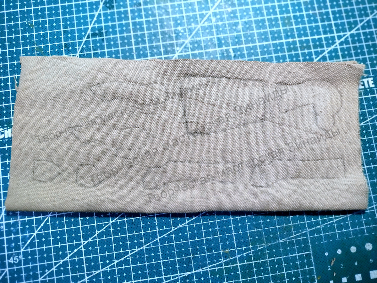 Складываю ткань пополам по долевой и обвожу выкройку карандашом.