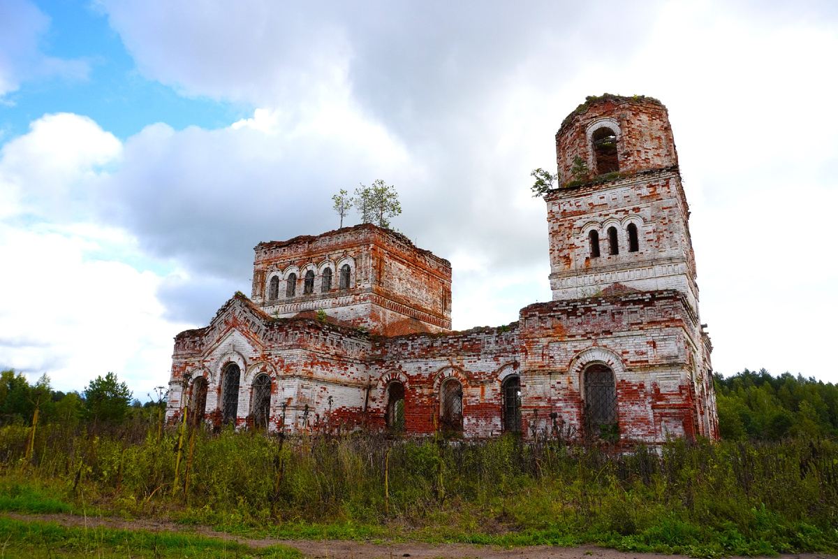 Теплый (то есть отапливаемый) храм с колокольней построен в 1912 году по проекту Ивана Чарушина. Рядом с ним возвели 1 каменный и 2 деревянных дома для священнослужителей. От каменного дома напротив церкви сейчас остались жалкие развалины, которые уже поросли молодым лесом.