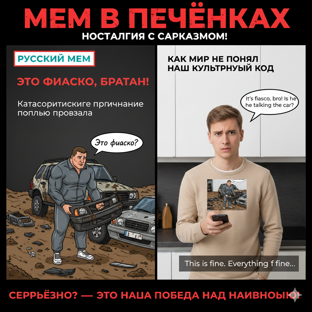 МЕМ В ПЕЧЁНКАХ "ЭТО ФИАСКО, БРАТАН!": Катастрофическое признание полного провала Диагноз: **ОСТРЫЙ СИНДРОМ НЕИЗБЕЖНОЙ НЕУДАЧИ С ПРИВКУСОМ ФИЛОСОФИИ!** Привет всем, кто хотя бы раз в жизни, столкнувшись с полным и безоговорочным провалом, выдыхал эту фразу, ставшую уже культовой! Сегодня мы препарируем мем, который прочно засел в наших печёнках благодаря своей универсальности и способности выражать драматизм, юмор и даже некоторую философскую покорность перед лицом тотальной неудачи: "ЭТО ФИАСКО, БРАТАН!". Эта фраза — наша коллективная отдушина, когда всё идёт не по плану, и худшие опасения подтверждаются. Этот мем — не про уныние, он про признание факта и способность посмеяться над собой, даже когда всё рушится. Почему "ЭТО ФИАСКО, БРАТАН!" так глубоко проник в нашу речь? Потому что он позволяет нам с юмором реагировать на самые безнадёжные ситуации, когда уже ничего нельзя исправить, и остаётся только констатировать полный провал. Готовы к полному фиаско? Погнали! Хроника Апокалип