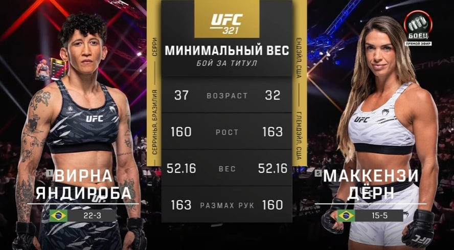У нас тем временем женский титульный поединок (не расходимся) 🏆 Яндироба 🆚 Дерн Смотрим бой за вакантный пояс в минимальном весе на Матч!Боец и Матч ТВ 📺 https://matchtv.ru/on-air