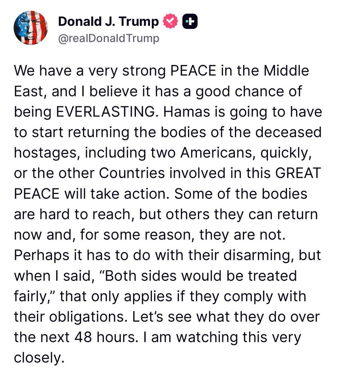 Trump issues new WARNING to Hamas Return hostage bodies ‘QUICKLY’ or we’ll ‘take ACTION’ ‘Let’s see what they do over next 48 hours… watching this very closely’