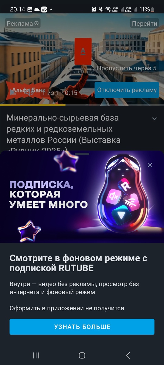 Но был и весьма существенный плюс, который пересадил меня на Рутуб практически полностью - это очень удобное приложение на андроид! В приложении не было вообще никакой рекламы, и оно - приложение - отлично работало в фоновом режиме безо всяких подписок. И вот, в марте 2025-го, вдруг откуда ни возьмись, в рутубовском приложении появилась реклама. Да сразу столько, что ни в какие рамки не лезет! Без зазрения совести стали крутить по два 20-секундных ролика с интервалом 5 минут! Терпеть такое было весьма не просто, и это был тревожный звоночек номер раз. И вот прямо сейча