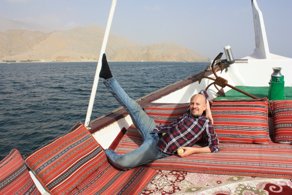 Из Дубая можно доехать до Омана, взяв экскурсию. Поплавать с маской и ластами среди кораллов, посетить чистейшие пляжи, порыбачить, отведать только что выловленные и приготовленные креветки, попробовать достать со дна ракушку с жемчужиной - и это всё в рамках одного дня. Едем на доу - это традиционная двухпалубная арабская лодка, устланная разноцветными коврами и мягкими подушками. Работают на лодках бенгальцы, поэтому приветствуем их на их родном языке - наше сотрудничество с музыкантами из Бангладеш не прошло даром, пару слов на бангла связать можем. Наш путь лежит среди выжженных солнцем скал со скудной растительностью. Но зато какое богатство флоры и фауны под водой! В этих водах одних только креветок обитает более 10 видов. И сама вода изумительного изумрудно-лазурного цвета, кристально чистая! Муж с кайфом расположился на носу нашего плавучего дома. Коля как-то рассказывал, что само слово "кайф" арабского происхождения и означает "наслаждение, приятное безделье, удовольствие". Го