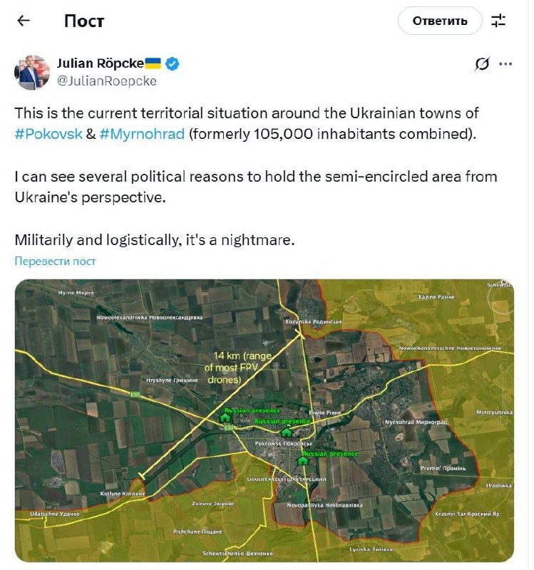 Юлиан Рёпке, аналитик немецкого таблоида Bild, отметил, что украинские войска оказались в «сжимающемся котле» под Покровском не из-за военной необходимости, а вследствие политических решений Киева.