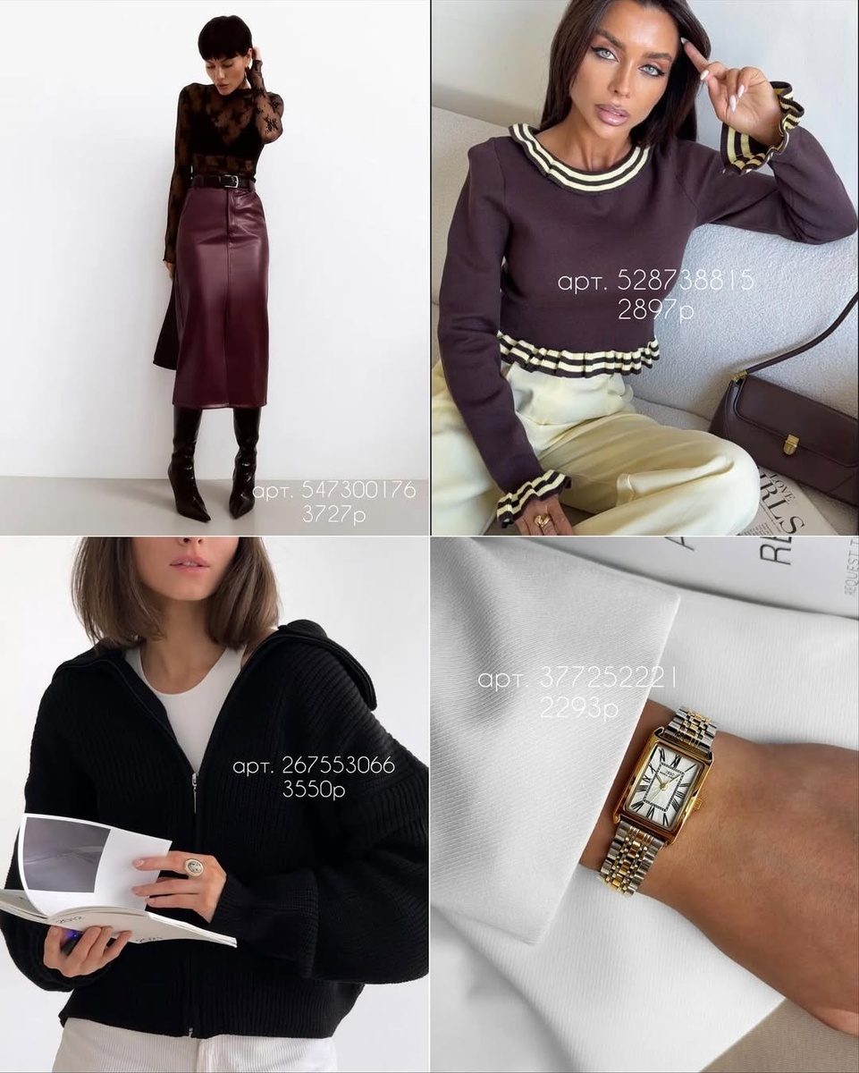 Эти восемь вещей складываются в гибкую капсулу. Основа — две сильные «верхние» позиции (твид и кожа) и одна идеальная юбка миди. Уют и баланс дают свитшот с волнистой отделкой и чёрный худи, а часы добавляют тонкую графику, которая делает любой комплект законченным. Держите палитру в диапазоне бордо — шоколад — оливка — молоко, играйте контрастом фактур и не перегружайте образ украшениями. Тогда каждая деталь зазвучит, а вы получите тот самый уверенный и очень современный городской стиль.
