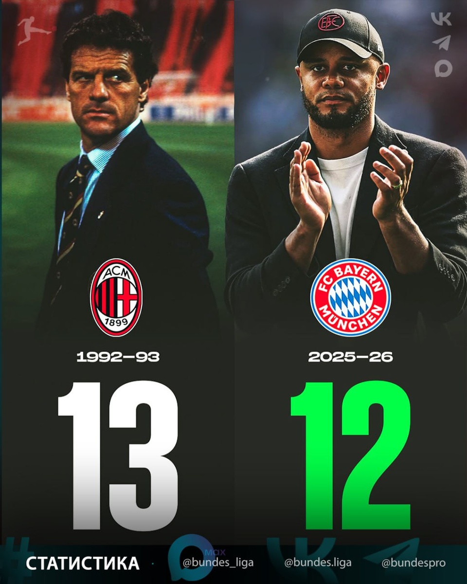 🤯 Мюнхенская «Бавария» установила рекорд среди клубов Бундеслиги, одержав 12 побед во всех турнирах на старте сезона. Среди всех клубов топ-5 лиг такая серия лучше была только у итальянского «Милана» под руководством Фабио Капелло в сезоне 1992/1993 (13 побед подряд на старте сезона). ⭐️ MAX /// Видео+ ❤ Телеграм /// Аналитика+ ✅️ Флагманская /// Новости+