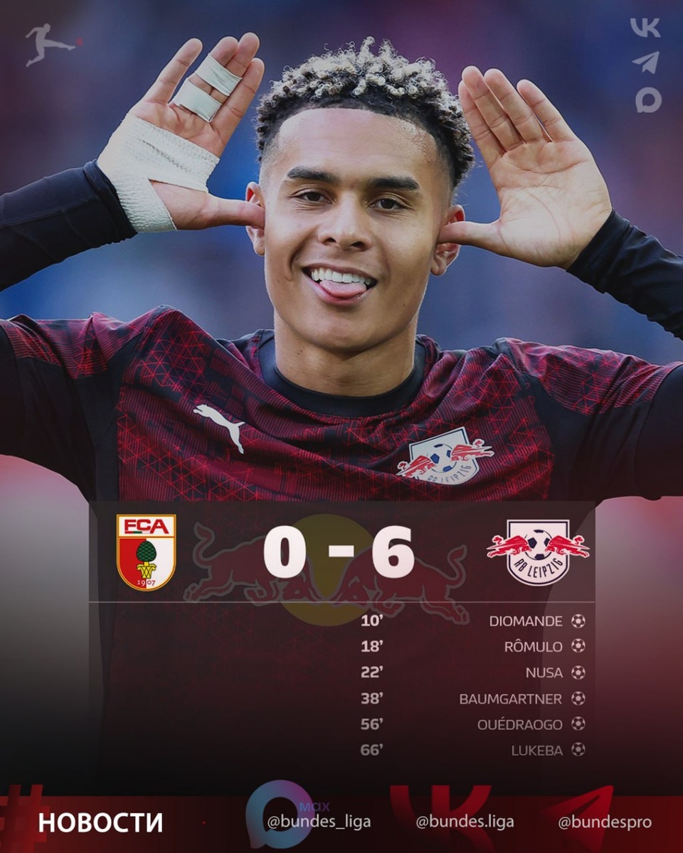 #Бундеслига ⚽️ 8 тур. «Аугсбург» - «РБ Лейпциг» 0:6 ⚽️ 10' Ян Диоманд (0:1) ⚽️ 18' Ромуло (0:2) ⚽️ 22' Антонио Нуса (0:3) ⚽️ 38' Кристоф Баумгартнер (0:4) ⚽️ 56' Ассан Уэдраого (0:5) ⚽️ 65' Кастелло Люкеба (0:6) «РБ Лейпциг» забил 6 голов на поле «Аугсбурга». «Быки» в течение 12 минут в середине первого тайма разыграли три комбинации, которые закончились голами. ⚡️ С 19 очками «РБ Лейпциг» закрепился на втором месте, соперник делит четвертую строчку с конца. ⭐️ MAX /// Видео+ ❤ Телеграм /// Аналитика+ ✅️ Флагманская /// Новости+
