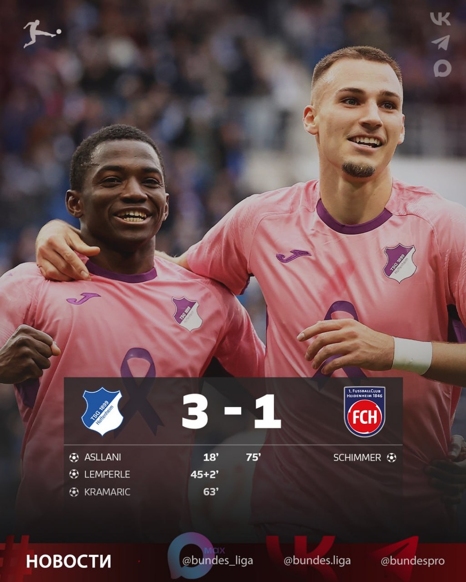 #Бундеслига ⚽️ 8 тур. «Хоффенхайм» - «Хайденхайм» 3:1 ⚽️ 18' Фисник Аслани (1:0) ⚽️ 45+2' Тим Лемперле (2:0) ⚽️ 63' Андрей Крамарич (3:0) ⚽️ 75' Штефан Шиммер (3:1) ⚡️В матче восьмого тура немецкой Бундеслиги «Хоффенхайм» на своем поле победил «Хайденхайм». На голы Фисника Асллани, Тима Лемперле и Андрея Крамарича гости ответили только точным ударом Штефана Шиммера. У «Хоффенхайма» стало 13 очков и седьмое место в турнирной таблице, «Хайденхайм» (4) — 17-й. ⭐️ MAX /// Видео+ ❤ Телеграм /// Аналитика+ ✅️ Флагманская /// Новости+