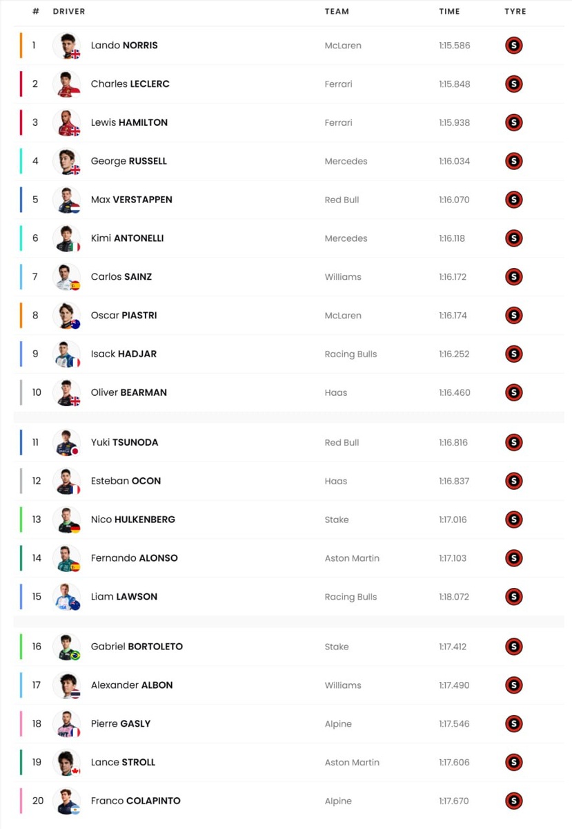 Результаты квалификации гран-при Мексики: Ну Оскара Фертстаппен опередил, а вот, что делать с Норрисом пока непонятно. Ландо нашел аж пол секунды преимущества на круге. Так ещё и впереди Макса оказались обе Феррари и Рассел. Всё пятничное преимущество Ред Буллов испарилось. Теперь надо смотреть на гоночный темп, возможно на более жёстких шинах картина будет другой. В целом Ред Булл сегодня ночью занимались тем, что перенастраивали машину на гонку. А Норрис похоже становится главным фаворитом в борьбе за титул. Исход гонки прогнозировать максимально сложно, можно только с уверенностью сказать, что Феррари опять будут ехать накатом и потеряют позиции. А вот Норрису завтра стоит бояться плохого старта, с такой длинной прямой можно потерять много позиций, так ещё и позади гонщики, которые давно не побеждали. Как и сам Хэмильтон сказал, лучшей позицией для старта тут является 3 место. Сколько сходов ждём в 1 повороте? Саинц своего 7 места лишится из-за штрафа в 5 позиций с прошлой гонки.