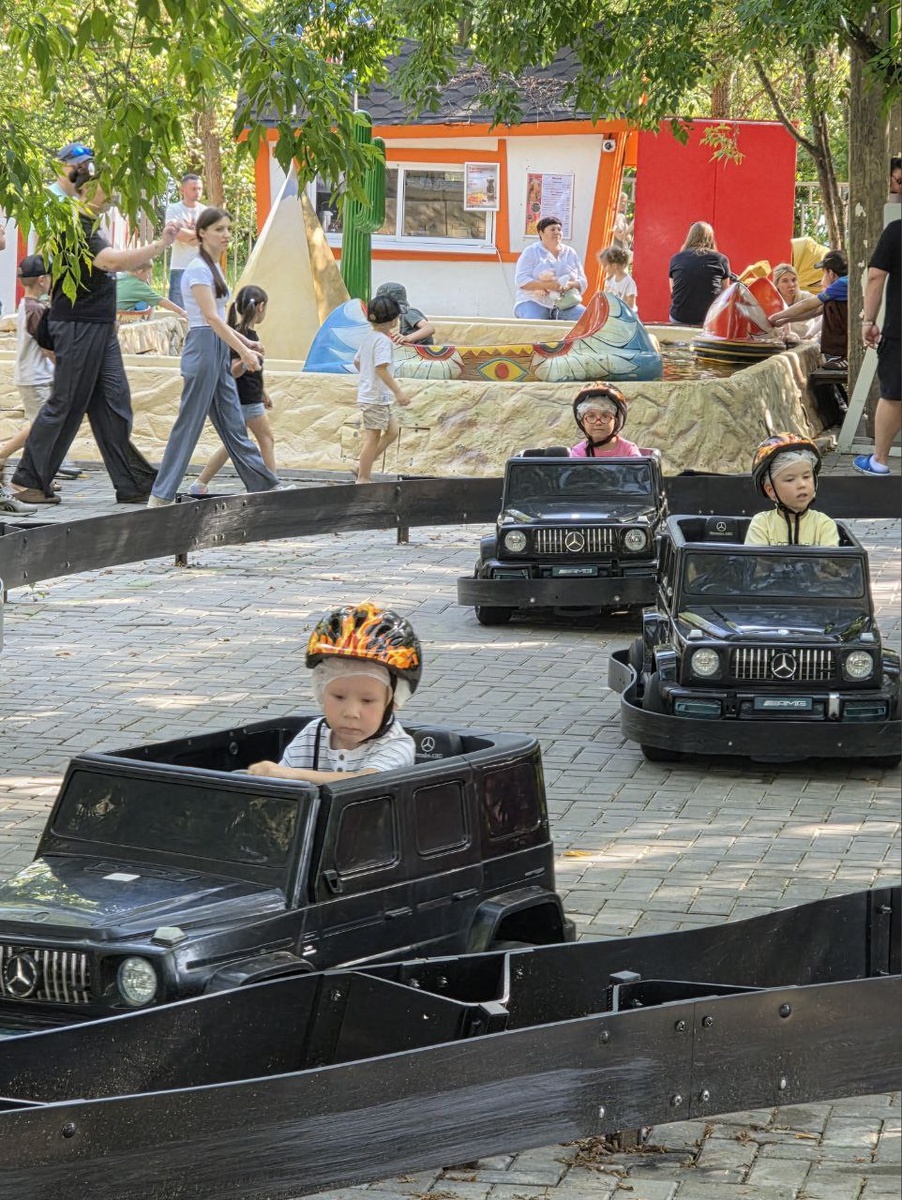 Затем мы разделились. Муж со старшей дочкой ушли испытывать экстремальные аттракционы, где вдоволь наорались, а мы с младшей катались на малышковых и семейных аттракционах, а потом провели много времени в этнопарке «Хаски лэнд», где Вероника обняла каждого пушистого друга🐶