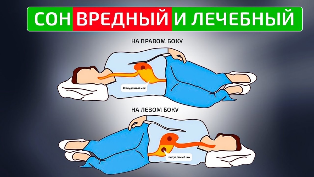 - Почему опасно: Левое положение способствует забросу кислоты в пищевод (ГЭРБ), что раздражает слизистую.