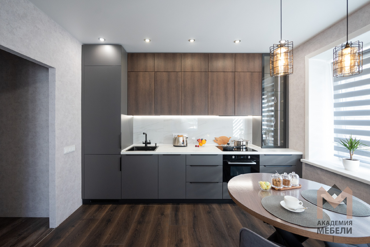 Светодиодная подсветка подчёркивает архитектуру кухни, делая приготовление любимых блюд комфортным даже в вечерние часы.