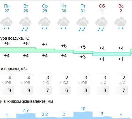 Вторник окажется не только теплым, но и дождливым. В этот день выпадет 7,7 миллиметров осадков. Богатой на осадки будет еще и пятница (10 миллиметров). В остальные дни дожди ожидаются, но будут небольшими.