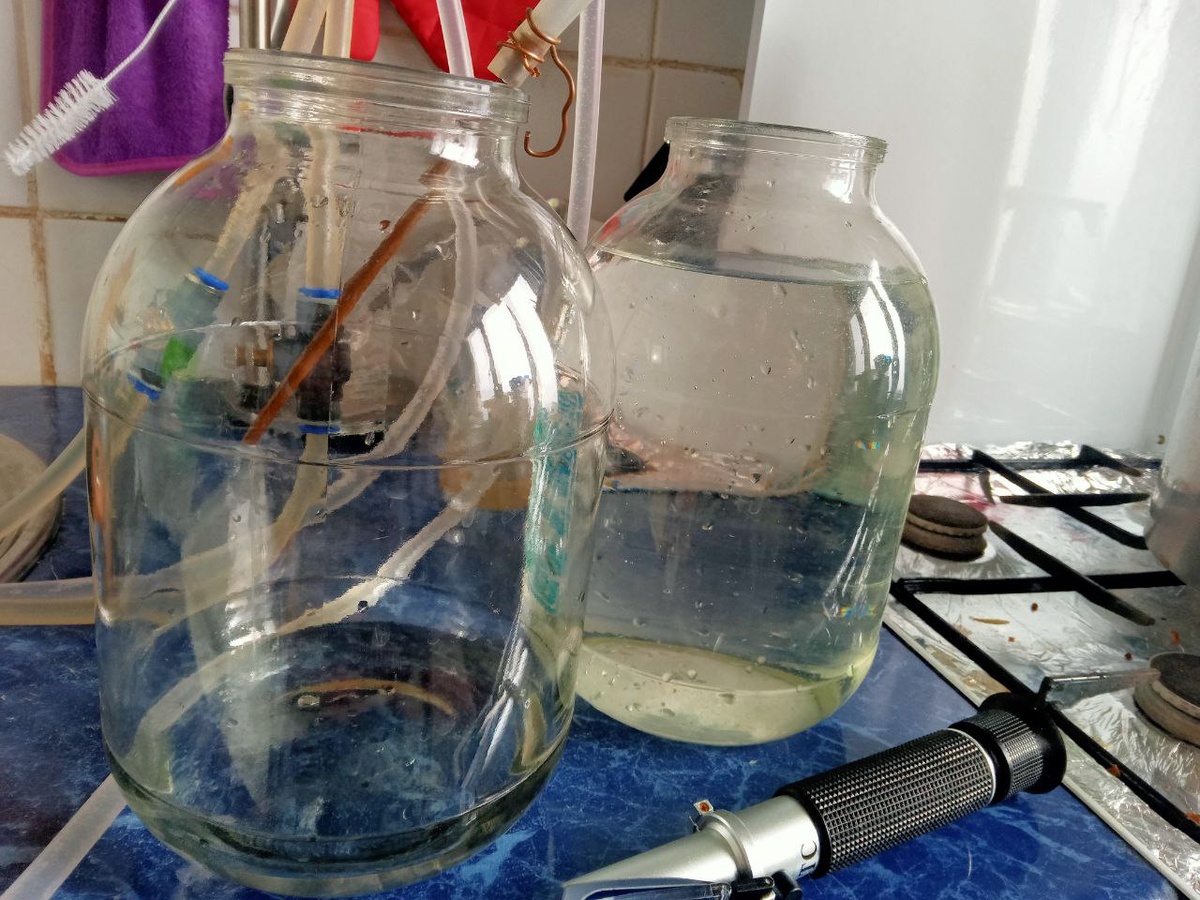 Одна канистра такая рассчитана на 25 литров сусла. Мы уже прошли с вами два шага. Первый шаг — это мы приготовили вот из этого концентрированного абрикосового сока брагу. Потом сделали первую перегонку этой браги.