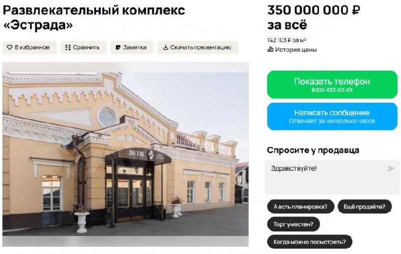 Развлекательный комплекс «Эстрада» в Иркутске продадут за 350 млн рублей 📌 В Иркутске на продажу выставили развлекательный комплекс «Эстрада». Его стоимость оценили в 350 млн рублей. 📌 В здании есть действующий бизнес. Имеются банкет-холл «Эстрада», ресторан «Бутин» с авторской кухней, караоке-клуб «Не стреляйте в пианиста» и летняя веранда «Дача Бутина», следует из данных в объявлении на популярном сервисе. 📌 Площадь участка составляет 2,5 тысячи квадратных метров, помещений – 2,2 тысячи «квадратов». Скриншот с сайта «Авито»