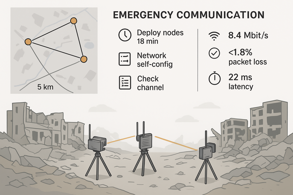 Статья* рассматривает практический кейс развёртывания временной радиосвязи в зоне природной катастрофы с использованием низкоэнергетических антенн и самоконфигурирующихся сетевых модулей. Представлен анализ отказоустойчивости каналов, методов быстрой калибровки антенн и влияния топографии на радиопокрытие. Результаты эксперимента демонстрируют возможность восстановления устойчивого канала передачи данных за 21 минута после полного разрушения инфраструктуры. 1. Введение После стихийных бедствий, таких как землетрясения или наводнения, наземные коммуникационные сети часто оказываются выведенными из строя. В таких условиях критически важна способность быстро развернуть автономную систему связи, обеспечивающую обмен данными между спасательными подразделениями. Компания RFAREAS разработала прототип системы RFA-RESCUE, включающей адаптивные антенны, модульные узлы питания и протокол самоконфигурирования сети на базе UWB+Wi-Fi гибридной архитектуры. 2. Методика 2.1 Исходные условия Кейс реа