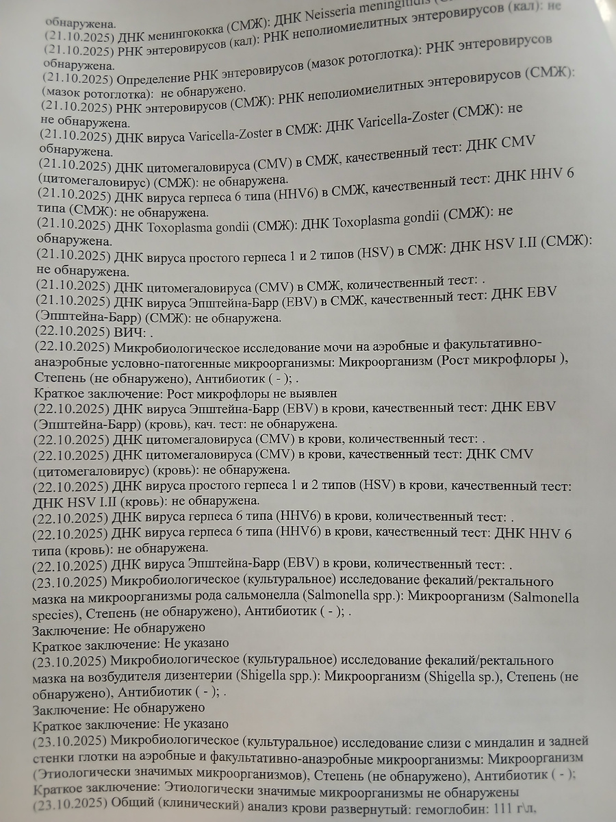 Ей сделали УЗИ (ЖКТ, почки), рентген (легкие, нос), ЭКГ, анализы мочи, крови, посевы на все что можно с чувствительностью к антибиотикам, проверили на все возможные распираторные и кишечные инфекции, ей сделали пункцию. Там только анализов несколько листов. Но все они пришли отрицательные. Был проведен полный осмотр всей девочки. Но ничего так и не нашли. Даже с горлом проблем не нашли, так как ничем не лечили и леденцы для горла мне вернули. Насморка, кашля не было, диареи не было. Рвота один раз была, но это ее обычная рвота она с ЖКТ видимо не связана.