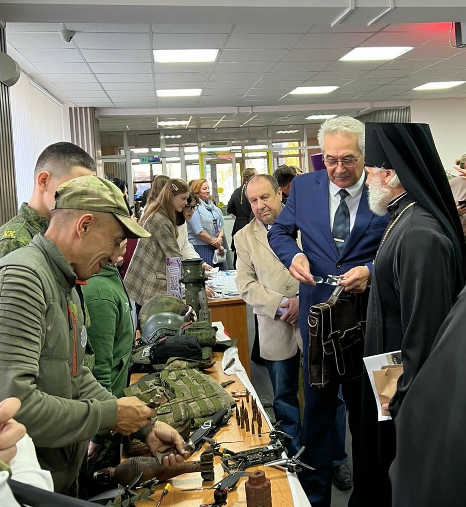 Перед началом мероприятия участники ознакомились с работой выставки, работавшей в фойе вуза. Внимание всех привлёк стенд мелеузовских волонтёров, помогающих участникам СВО.