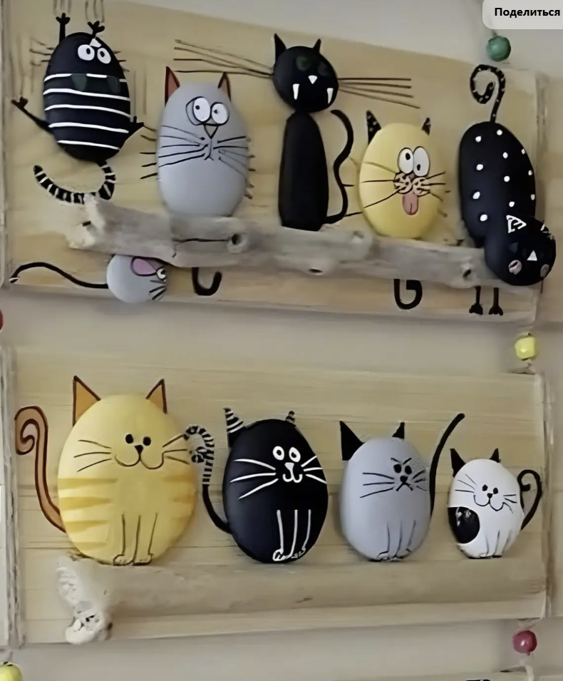 Я очень загорелась идеей сделать для дома что-то подобное. Поскольку я очень люблю котиков (а кто их не любит? 😃) то меня очень привлекла идея сделать ключницу с такими котиками. ✅ Идеи ключниц с использованием камушков очень вдохновили. Публикую несколько вариантов работ мастеров, но на мой взгляд фантазии нет предела. ✅ Далее на фото вы увидите разные варианты декоративных панно. Эти идеи можно переделать по своему усмотрению и желанию. Все эти котики - это просто раскрашенные камушки. А еще это не так затратно, нужны лишь акриловые краски и