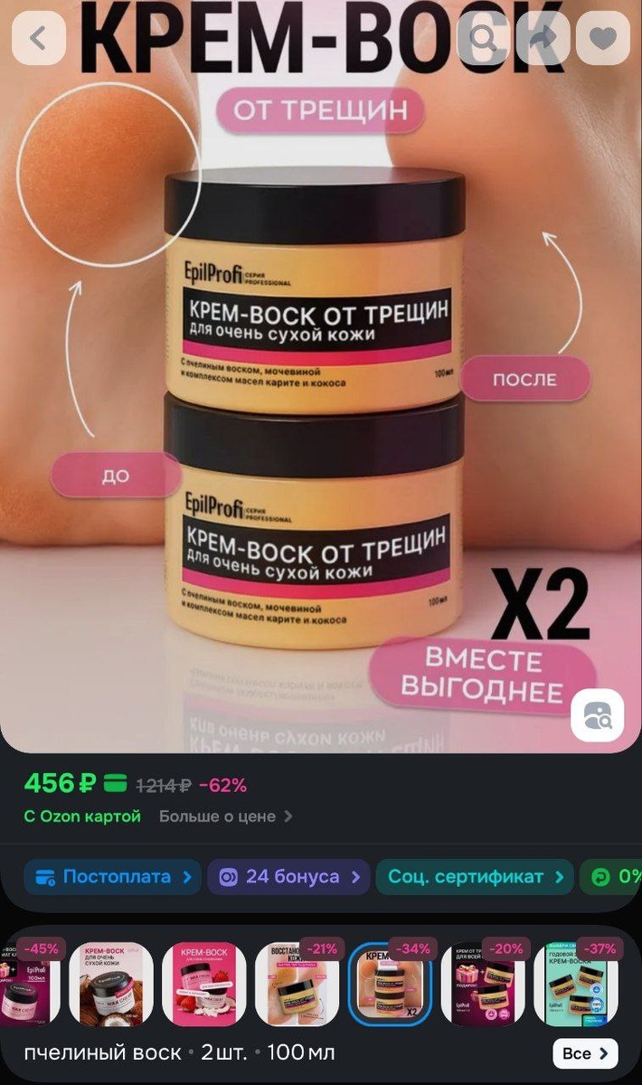 EpilProfi Крем воск от трещин для очень сухой кожи: пяток, рук, ног, тела, 100 мл * 2 шт ➕ 150 бонусов в карточке товара около названия магазина (ими можно оплатить 25% от суммы) https://ozon.ru/t/uCoNR5I