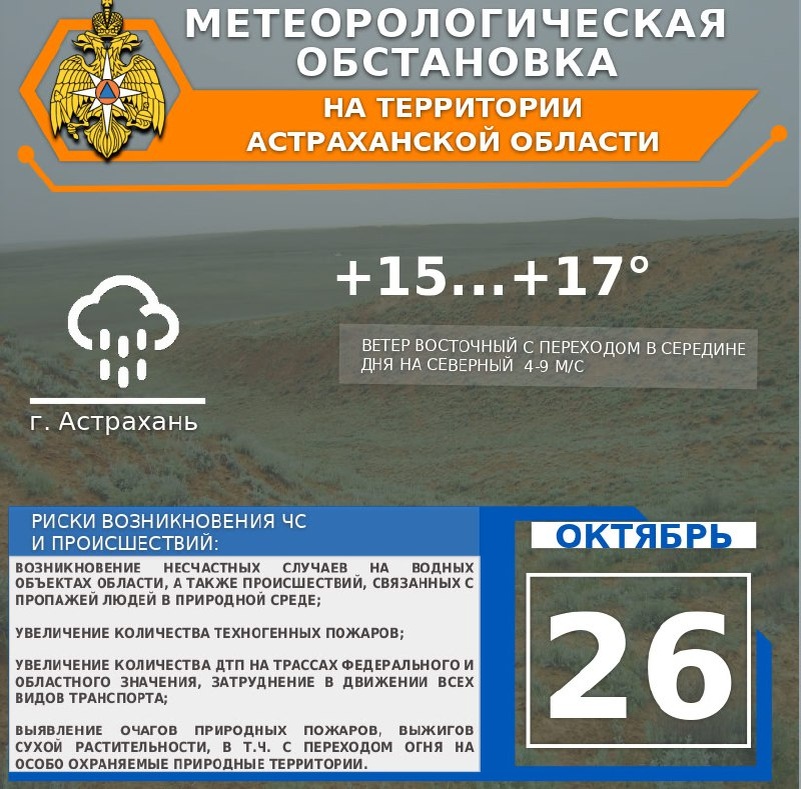 🍂Метеорологическая обстановка на 26 октября ☁️На территории облачно. ☔️Небольшой и умеренный дождь. По крайнему северу без существенных осадков. 🌬Ветер восточный с переходом в середине дня на северный, северо-западный 4-9 м/с. 🌡Температура воздуха днем +12...+17°, ночью +5...+10° ☁️По г. Астрахань облачно. ☔️Небольшой дождь. 🌬Ветер восточный с переходом в середине дня на северный 4-9 м/с. 🌡Температура воздуха днем +15...+17°, ночью +8...+10°. ✅Присоединяйся к МЧС Астрахань 👉🏼Подписывайся на МЧС России в Telegram | MAX
