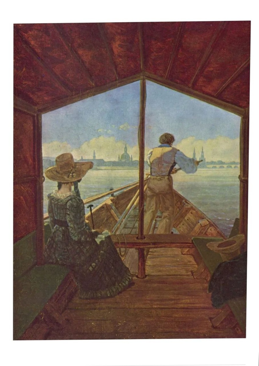 В творчестве Каруса есть ряд картин, прямо посвященных теме духовного родства и безмолвного тайного диалога человека и природы. В этих картинах человек не располагается естественно на лоне природы, как стаффаж в классическом пейзаже. Он всегда вне ее, смотрит на нее из окна, из проема, с террасы, но объединен с пейзажем по-другому - сопереживанием, общностью духовного состояния. Такова "Дама на террасе" (1824), устремившая взгляд в голубоватую рассветную даль. Такова одна из самых известных картин Каруса "Переезд в барке через Эльбу" (1827). Из темного пространства крытой барки, глазами сидящей здесь молодой нарядной девушки мы смотрим на реку и сияющий вдали на противоположном берегу, растворяющийся в солнечном свете пейзаж с силуэтом Дрездена и проникаемся ее состоянием радостного ожидания, порыва из темноты к свету, от обыденности - к чуду.