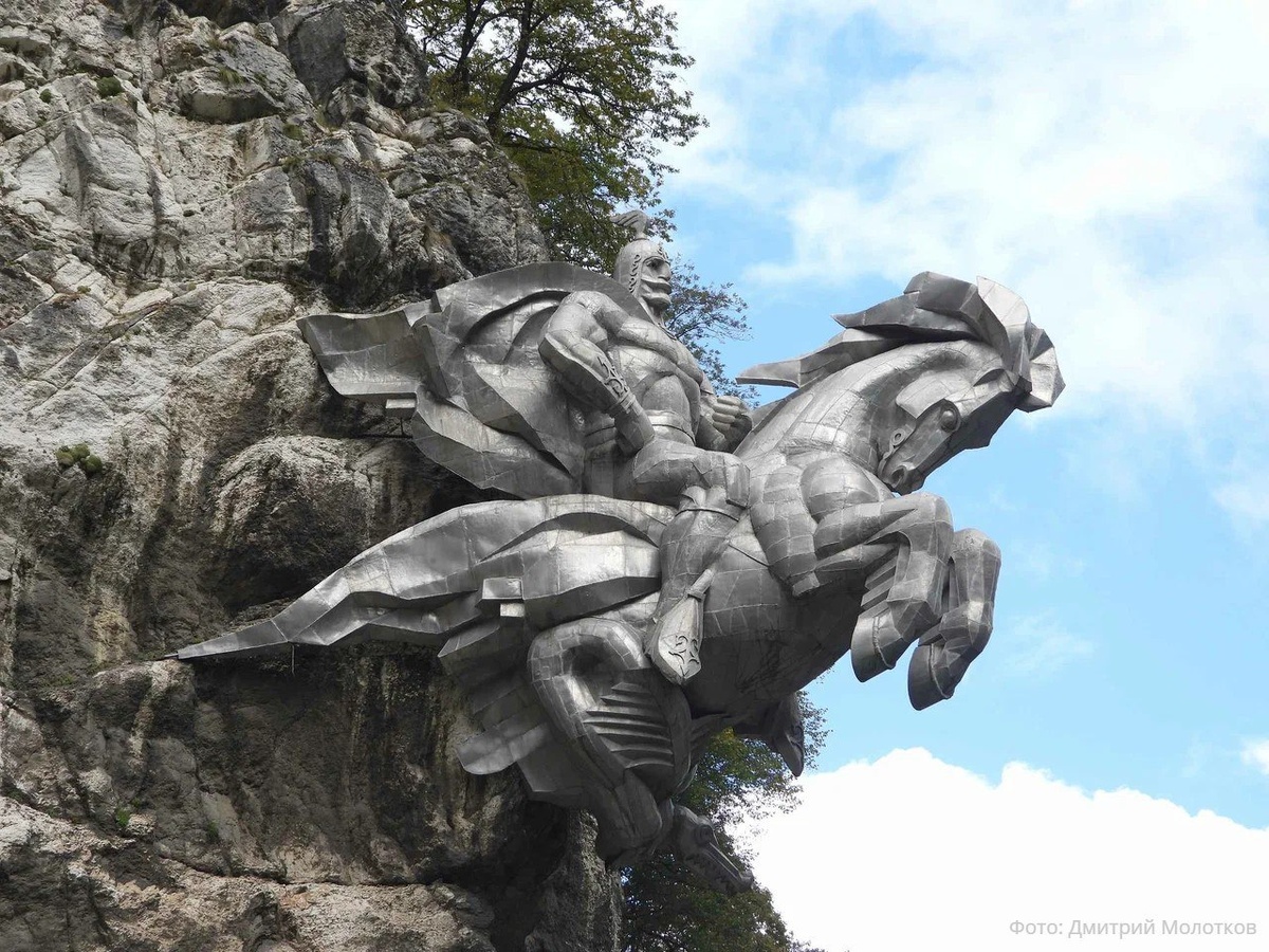Памятник Уастырджи Памятник встречает путников на одном из участков Транскавказской трассы (Республика Северная Осетия-Алания, Алагирское ущелье) и это всегда происходит неожиданно – настолько монументальной получилась скульптура. Несмотря на свою монументальную мощь, статуя кажется очень динамичной, с вытянувшемся в прыжке конем и восседающим на нем Уастырджи. Монумент этот был возведен в 1995 г. по проекту Н. В. Ходова в дар Северной Осетии. Вес скульптуры составляет аж 28 тонн. Внизу, под памятником Уастырджи находится небольшая пещера ритуального назначения, в которой размещена чаша для подношений. В эпосе осетинского народа святой Уастырджи был небожителем, который частенько спускался с небес для того, чтобы оказать помощь в том или ином деле и посмотреть, насколько праведно поступает его народ. Уастырджи имел волшебную силу, мог воскрешать умерших и даже принимать самый разный облик. Примечательно, что женщинам нельзя даже упоминать имя осетинского Георгия Победоносца. И день