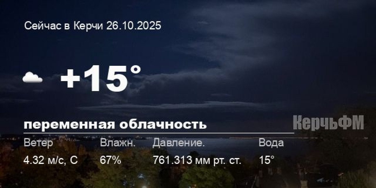 Сегодня днем в Керчи, 26 октября, ожидается пасмурная погода, температура воздуха от +12.7° до +16°С, ветер северный 3.35 м/с, порывы до 6.01 м/с, давление 760.6 мм рт. ст., влажность 67%.