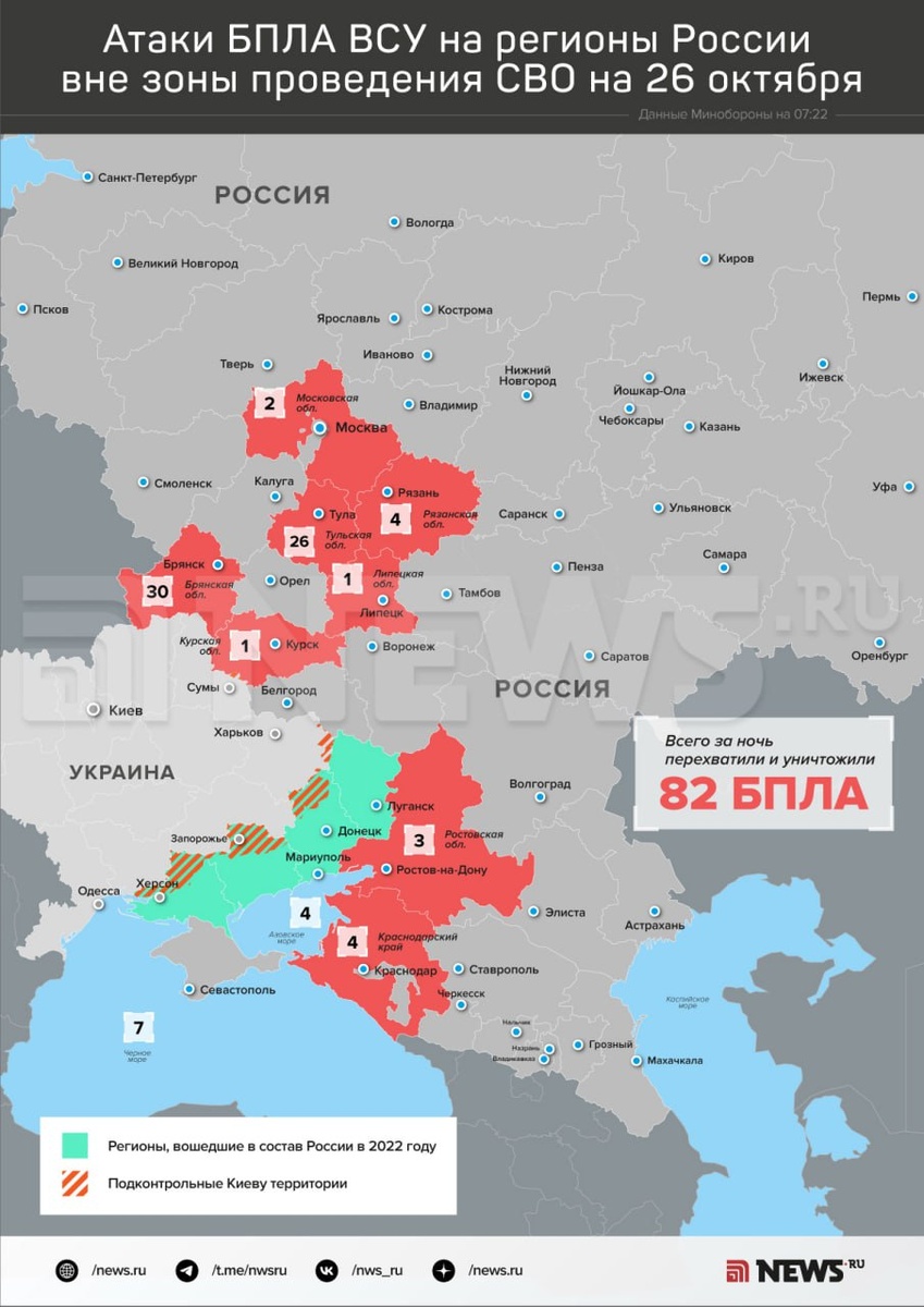 Силы ПВО за ночь уничтожили 82 украинских БПЛА над российскими регионами, сообщает Минобороны. 30 дронов сбили над Брянской областью, 26 — над Тульской и семь над Черным морем. Подробнее — в нашей инфографике. ⭕️ Подписаться | Мы в MAX | Буст