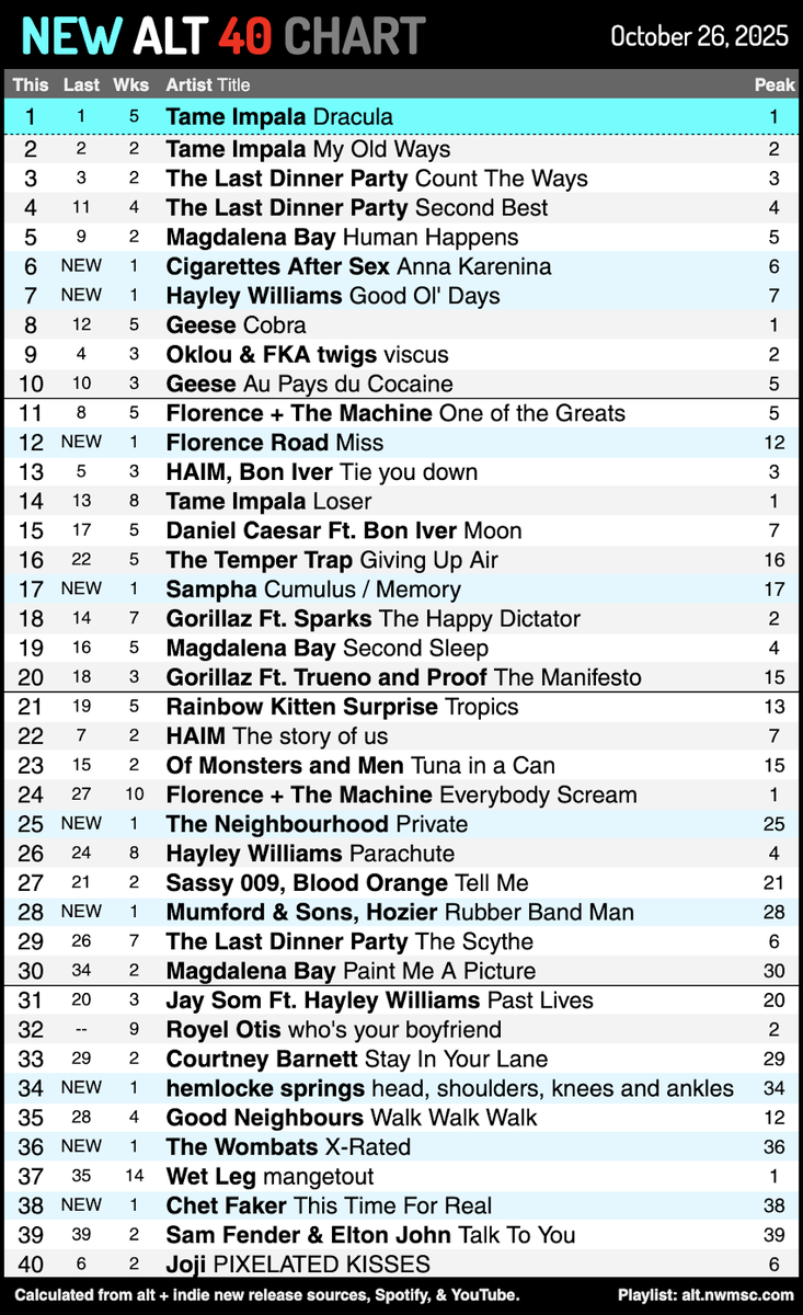 TAME IMPALA четвертую неделю подряд на первом месте с песней «Dracula», которая становится гимном праздника Хэллоуин в этом году.