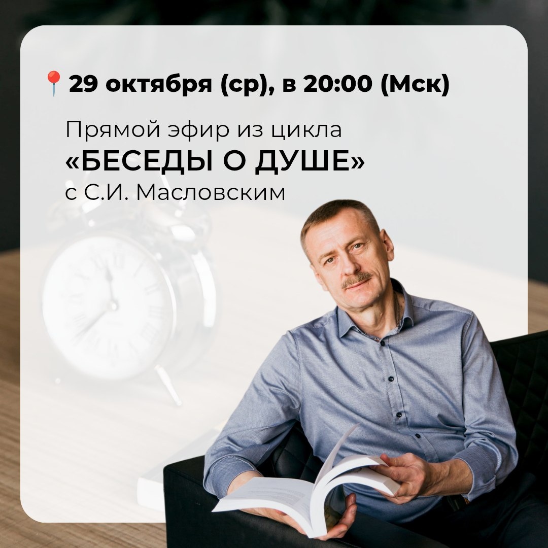 Давайте побеседуем о душе? 🕊 Приглашаем вас на новую встречу с Сергеем Ивановичем Масловским, где мы сможем поговорить о глубоких и важных вещах: душа, духовность, их роль в нашей повседневной жизни и как с помощью этих знаний гармонизировать все сферы своего существования. Дорогие друзья, предлагаем вам самим выбрать тему для обсуждения. Сделать это очень просто: - Оставьте ваш вопрос в комментариях под этим постом. - Направьте предложение через анонимный бот. - Свяжитесь с нами через сообщения в нашем канале — нажмите на значок 💬 в левом нижнем углу. 💬 Живое обсуждение интересных и полезных для вас тем — бесценно! Встреча состоится в среду, 29 октября, в 20:00 (Мск). Присоединяйтесь!