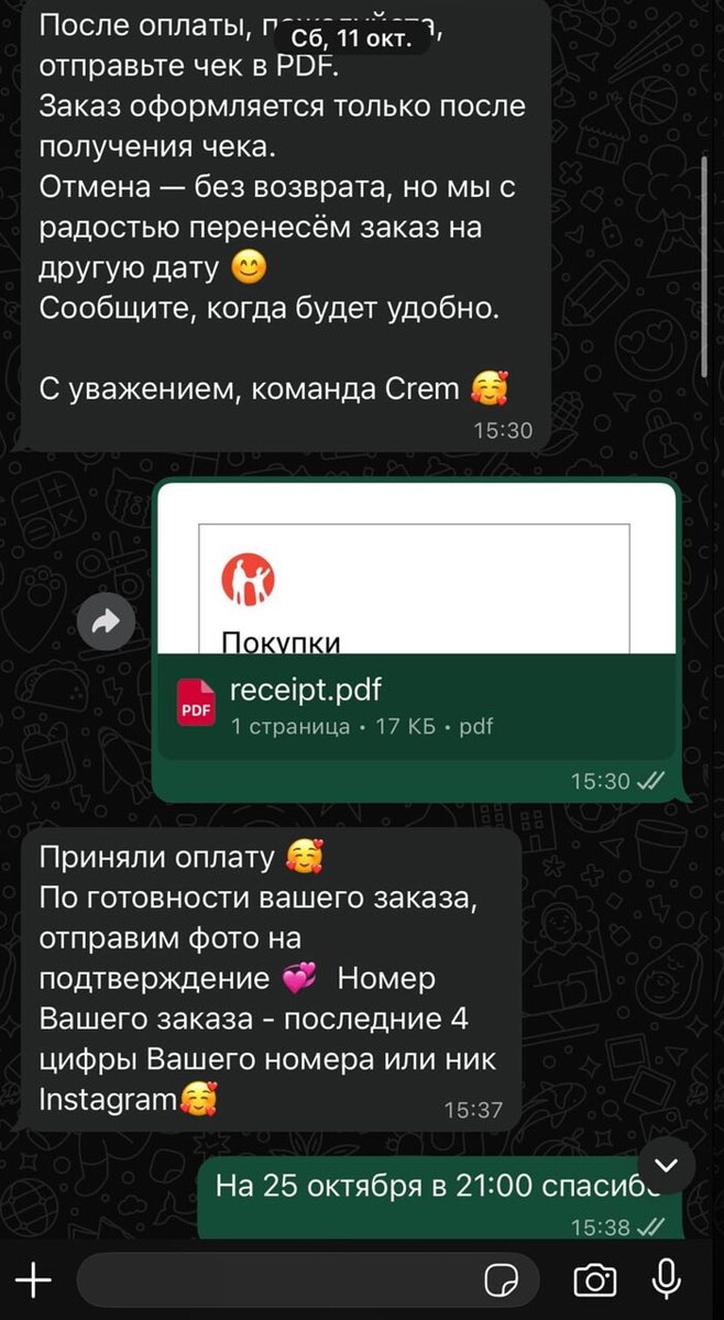 Никогда не была скандалисткой, но в этот раз не смогла удержаться. Я из Казахстана, у нас в Алматы есть кондитерская, распиаренная блогерами. Делала у них заказы в 2023 и 2024 году, начинки вкусные, без вопросов.