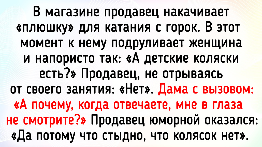 - В магазине продавец накачивает «плюшку» для катания с горок. В этот момент к нему подруливает женщина и напористо так: «А детские коляски есть?» Продавец, не отрываясь от своего занятия: «Нет». Дама с вызовом: «А почему, когда отвечаете, мне в глаза не смотрите?» Продавец юморной оказался: «Да потому что стыдно, что колясок нет». © Montenegro7 / Pikabu