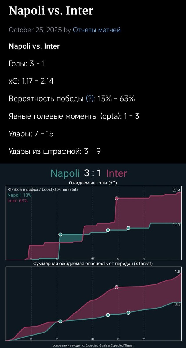 Посмотрел матч в повторе. Удивлён, как Интер, при их обычно хорошей реализации, сумел забить лишь один. И то после странного гола от Мактоминея в переходной фазе. Несомненно красивый удар и реализация от Скотти, но просто нулевая скорость в стремлении защитить свои ворота от игроков обороны гостей. В атаке у команды Киву всё по-прежнему неплохо. Структура осталась, как при Индзаги. Но есть ощущение, что при Симоне игроки его побаивались и работали под его контролем, а у Киву, тренера, привыкшего к молодёжке, пока не хватает авторитета и опыта. Что дальше? Многие говорят, что уверенность и качество вернутся, ведь игровые метрики у Интера всё ещё на месте. Не думаю. Да, команда по-прежнему хороша с мячом, но есть вопросы к беговой работе и дисциплине в обороне. Зоммер уже не тянет, а ключевые игроки перешагнули пик формы. Поражения от Юве и Наполи могут ударить по психологии и тогда всё покатится. Если коротко: не верю в Киву. После Индзаги это очевидный даунгрейд.