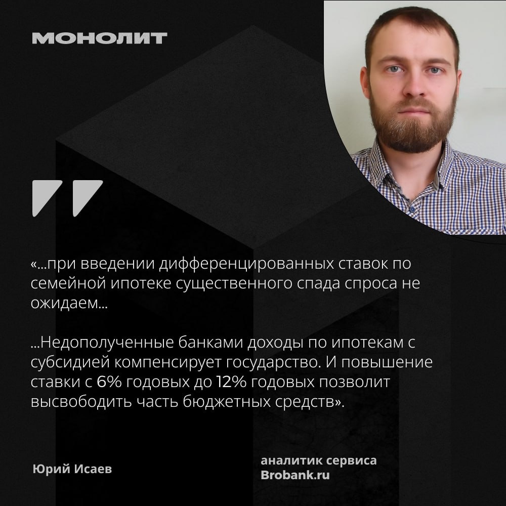👤 Дифференциация ставок по Семейной ипотеке: плюсы и минусы 🗣Мнение аналитика сервиса Brobank ru Юрия Исаева: Дифференцированные ставки по семейной ипотеке — дискуссионное предложение. С одной стороны, такой вариант целевых займов для покупки жилья должен подталкивать граждан к рождению большего количества детей. С другой — невозможность обеспечить достойным жильем даже одного ребенка не стимулирует россиян к рождению второго и последующих. Если оценить в общем рынок и текущие предложения, то при введении дифференцированных ставок по семейной ипотеке существенного спада спроса не ожидаем. На текущий момент предлагается 12% годовых для семей с одним ребенком. Даже при таких условиях ипотека заметно выгоднее, чем общерыночные условия, по которым ставка превышает 20% годовых. Предложенное изменение позволит добиться сразу двух факторов: 1. Подтолкнет россиян к большей рождаемости. Оговоримся, кардинально демографическую ситуацию это не изменит. Ведь ипотека — это долгосрочное долго