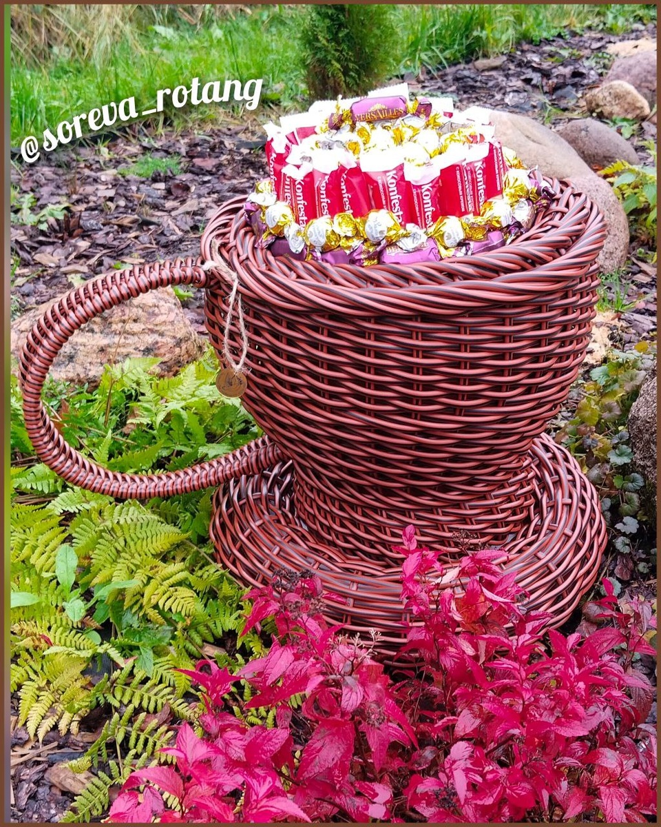 Знаете, как на день рождения часто желают "полную чашу", "сладкую жизнь" и, конечно, "конвертик на всякие приятности"? Вот я решила воплотить все эти добрые пожелания в одном подарке! Получилась такая вот композиция: уютная чайная пара из ротанга на память о моменте, яркий букет из конфет – как символ той самой сладкой жизни, и, конечно, конверт с приятным сюрпризом. Очень надеюсь, что имениннице всё это пришлось по душе!