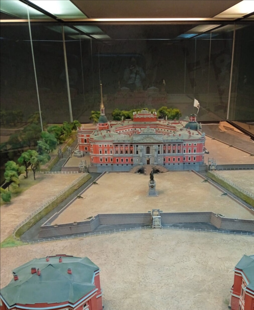 Всем привет. В предыдущей статье рассказывала о двух выставках в Михайловском замке. Об этом можно прочитать тут, 👇кто не читал. А сегодня расскажу немного про сам Михайловский замок. Замок очень большой, это видно на макете и наяву, когда выходишь во внутренний двор, но открыто для посетителей совсем немного залов. Мне думается, что третья часть, а может и того меньше. Ну да, меньше трети. Мы вошли в главные ворота и пошли налево, там вход в музей, а вышли с бокового входа, где расположена колокольня, там церковь, а что находится в большей части замка, неизвестно. Может, там тоже какие-то экскурсии проводятся, и надо купить отдельный билет. Обязательно поинтересуюсь. Сейчас рва с водой перед памятником Петру нет, он давно засыпан, а остался ров только возле замка. Посетив две выставки Федора Васильева и Алексея Пахомова, мы попали в зал, где висят портреты императоров. Жаль потолок не сфотографировала. Видно, что на потолке большая картина. Остальных императоров я сфотографир