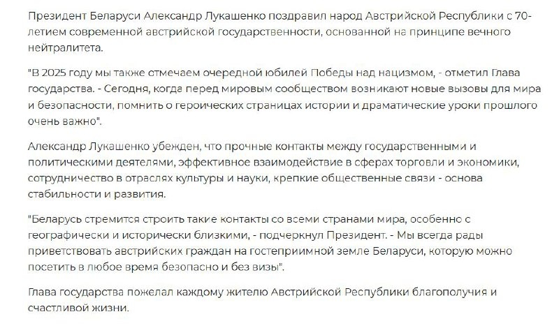 Лукашенко, поздравляя народ Австрии с 70-летием современной австрийской государственности, призвал австрийцев помнить о драматических уроках