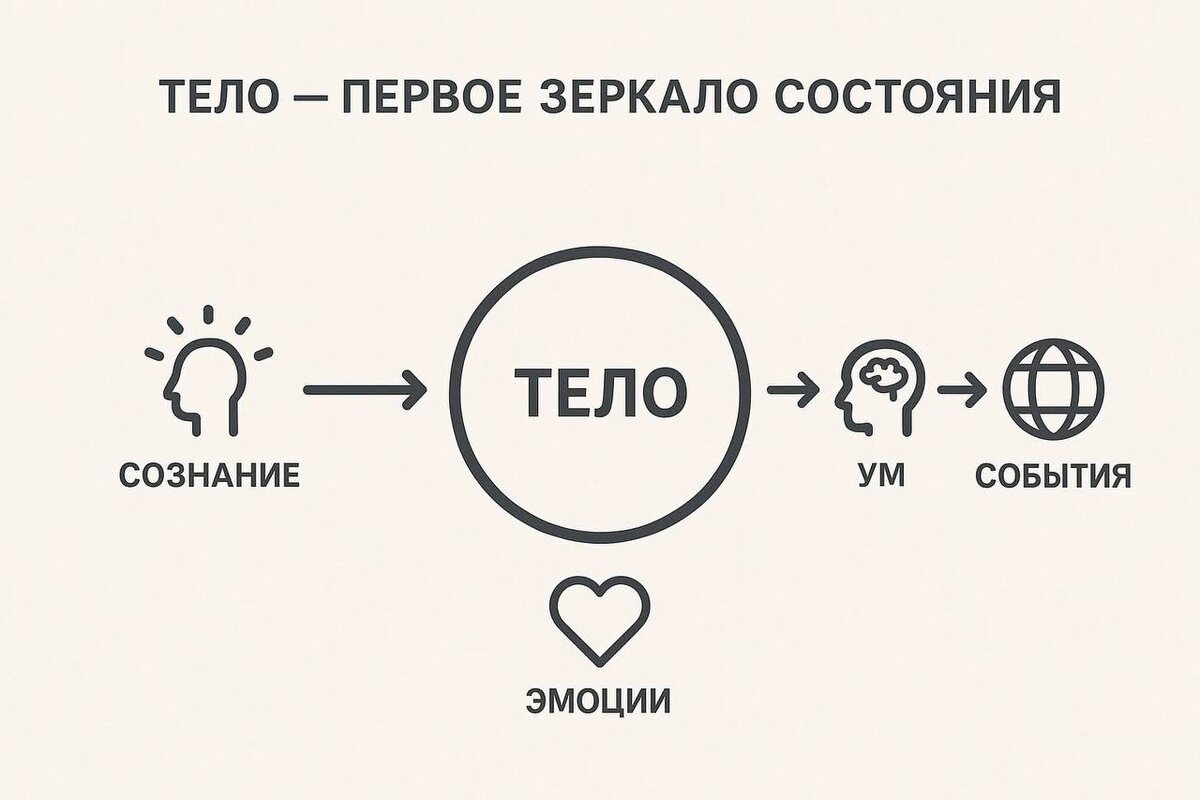 «Тело — первое зеркало состояния» тело — это первое зеркало, в котором отражаются все состояния — до того, как они становятся мыслями, эмоциями или событиями. Разложим, чтобы увидеть глубину этого: 🔹 1. Тело — граница между невидимым и проявленным Сознание не может напрямую показать своё состояние — оно делает это через тело. Каждая мысль, каждая вибрация внимания отражается телесно мгновенно: дыханием, тонусом, микродвижением, ритмом, температурой. 💡 Тело — первая поверхность, где волна состояния становится видимой. 🔹 2. До эмоций и слов — всегда ощущение Эмоция — это уже интерпретированное телесное отражение. Но если вниманием поймать момент до того, как ум назвал чувство, можно увидеть саму первичную волну — например, лёгкое сжатие в груди, холод в животе, тепло в ладонях. 💬 Это и есть «оригинальное состояние» до объяснения. В теле оно говорит напрямую, без символов 🔹 3. Каждое зеркало дальше — лишь копия телесного отражения • Ум читает тело и создаёт мысль. • Мысль