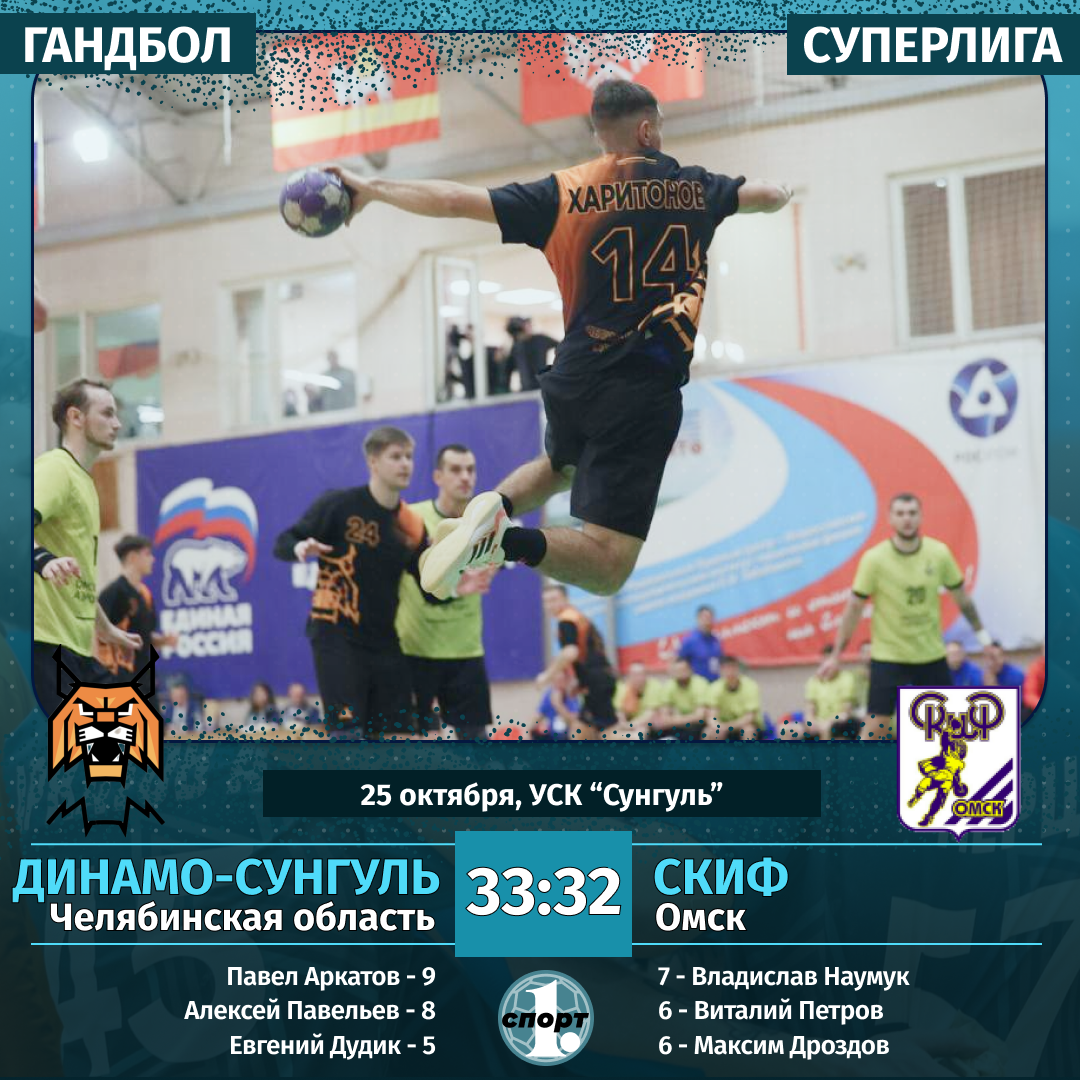 Гандболисты клуба «Динамо-Сунгуль» одержали непростую домашнюю победу в чемпионате Суперлиги. Южноуральцы выиграли с минимальным счетом у дебютанта турнира омского «Скифа» — 33:32. Благодаря этому успеху «Динамо-Сунгуль» закрепился в зоне плей-офф и занимает 7-ю строчку в турнирной таблице, сообщает корреспондент ИА «Первое областное». Южноуральский коллектив был безусловным фаворитом в этом противостоянии. Три сезона подряд «Динамо-Сунгуль» выходил в плей-офф Суперлиги. Омская команда пополнила элиту чемпионата страны. И выходцам из Высшей лиги пока приходится сложно в матчах с топовыми командами Суперлиги. В семи играх «Скиф» потерпел семь поражений. Проиграли сибиряки и в этом поединке. Но заслужили комплименты в свой адрес. Им удалось дать бой старожилу Суперлиги. Первая половина игры завершилась вничью — 11:11. Надо отметить, что хозяева площадки не лучшим образом действовали в атаке, этим и можно объяснить низкую результативность. Впрочем, южноуральцы во втором тайме прибавили в