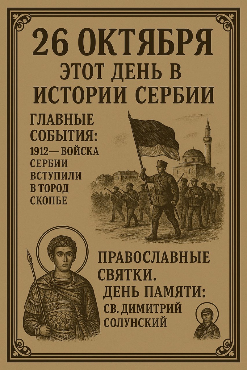 26 октября 1912 — войска Сербии вступили в город Скопје (Uskup) во время Первой балканской войны, что стало важным этапом расширения сербской территории и укрепления её позиций на Балканах.