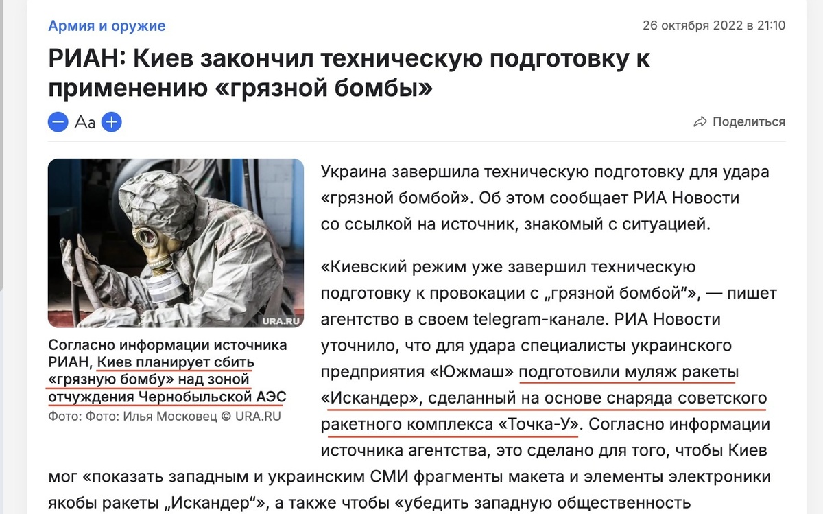 - РИА Новости со ссылкой на "источник, знакомый с ситуацией" опубликовало следующее сообщение: "Киевский режим уже завершил техническую подготовку к провокации с «грязной бомбой»: специалисты украинского предприятия «Южмаш» подготовили муляж ракеты комплекса «Искандер», который планируется начинить радиоактивным материалом, а затем якобы сбить над зоной отчуждения Чернобыльской АЭС силами украинской ПВО и заявить о пуске ядерного заряда российскими вооруженными силами".