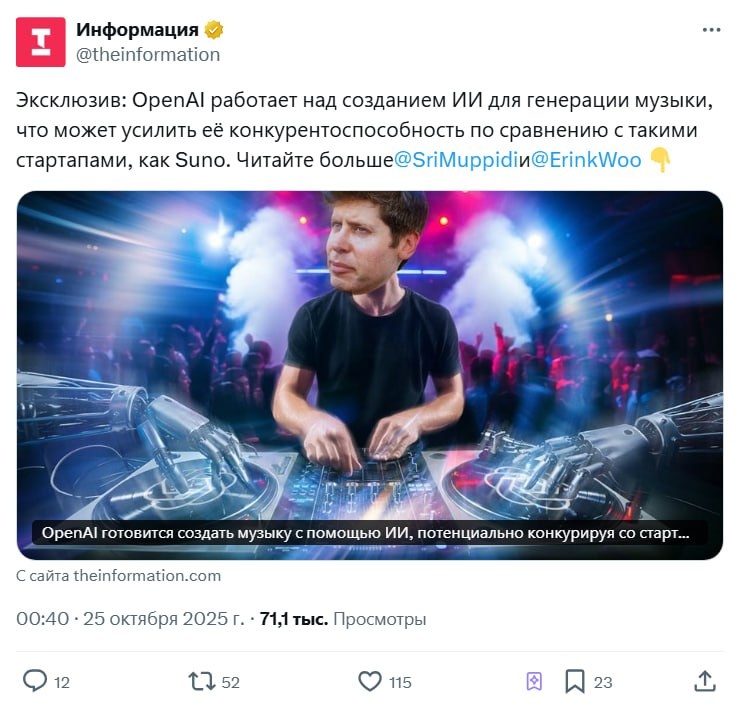 OpenAI пилит своего «Suno» — генератор музыки на ИИ Инсайдеры пишут, что команда делает модель, которая умеет генерить треки и аккуратно работать с инструментами. Говорят, даже подключили музыкальные школы для отладки качества и параллельно ведут переговоры с крупными лейблами — чтобы не схлопотать иски за обучение на каталоге. Если это выстрелит, нас ждёт новая волна ИИ-музыки — от джинглов до полноценных релизов. Вопрос: вы за «музыку от нейросетей» или это добьёт молодых артистов? #Techtaim