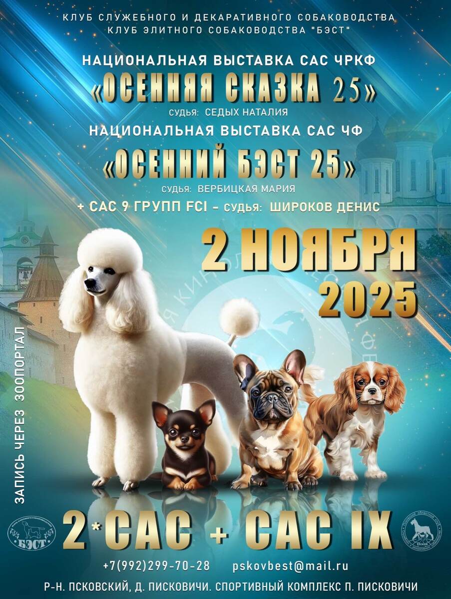 ⏰ 2 ноя (7д) 🏛 #Псков #Россия #Выставка 🐶 Выставка собак: ОСЕННЯЯ СКАЗКА 25 🏆 Клуб элитного собаководства "Бэст" Контакты организаторов здесь: 🌐 https://www.petsman.ru/vystavki-sobak.php?mesto=54-pskov Выставка собак всех пород, ранга САС-ЧРКФ 🟡"ОСЕННЯЯ СКАЗКА 25"🟡 Выставка собак всех пород, ранга САС-ЧФ 🔷"ОСЕННИЙ БЭСТ 25"🔷 🟨Выставка САС 9 группы FCI🟨 +ТЕСТИРОВАНИЕ ПОВЕДЕНИЕ🦮❗️ + 2 ПЛЕМЕННЫХ СМОТРА 🧑 👨 Эксперты: 🔹 Наталия Седых (Санкт- Петербург) 🔹 Мария Вербицкая (Минск) 🔹 Денис Широков (Санкт- Петербург)