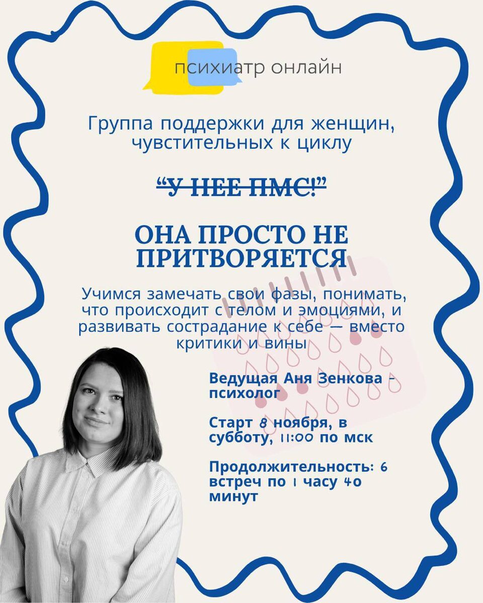 «Психиатр Онлайн» приглашает в группу поддержки для женщин, чувствительных к циклу (ПМС и ПМДР) от Анны Зенковой
