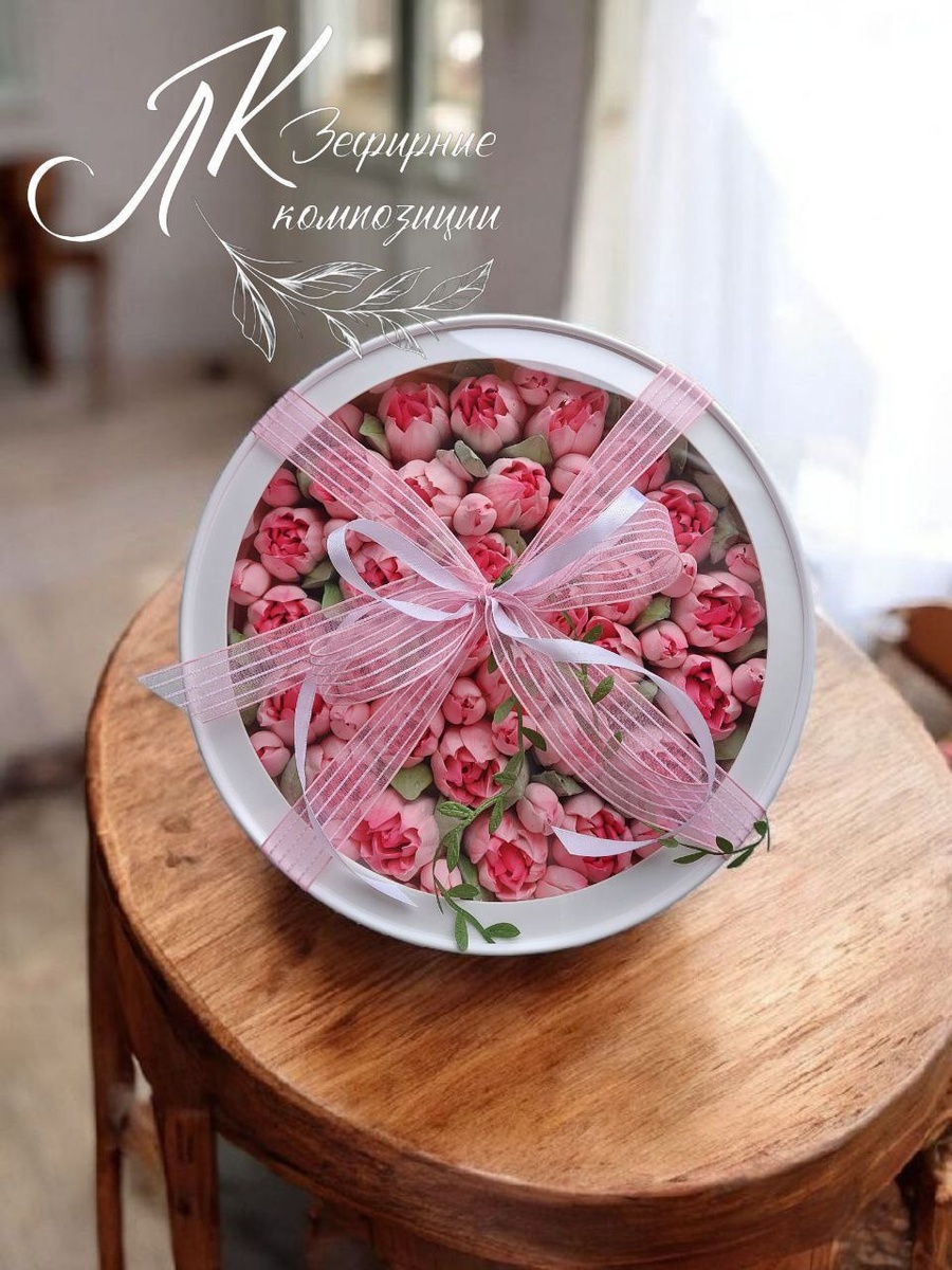 Коробочка 30см с зефирными тюльпанами отправилась поздравлять именницу в день её рождения
