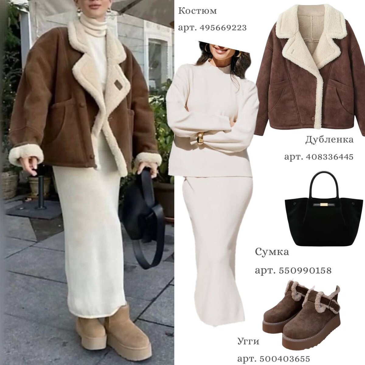 Ноябрь — тот месяц, когда время будто замедляется. Город ещё не заснул, но уже перестал спешить. Люди кутаются в шарфы, улицы пахнут кофе, воздух становится морозным. Всё вокруг становится спокойнее. И именно в это время особенно важно не «выглядеть», а чувствовать. Одежда перестаёт быть просто одеждой. Она становится уютом, защитой, привычным ритуалом. В ноябре стиль рождается из тепла — того, что ближе к телу, чем к трендам. Я собрала пять уютных образов с WB для ноября 2025 года — тех, в которых легко быть собой. Без спешки, без заморочек, с простыми линиями и чуть-чуть текстуры, как у любимого шарфа. Перейти прямо к данному посту в Telegram с активными ссылками на вещи Молочный костюм и короткая дублёнка — одно из тех сочетаний, где нет ничего лишнего, но есть всё нужное. Замша, мех, трикотаж — тактильное удовольствие на максимуме. Угги и вместительная сумка завершают образ в стиле «уютный минимализм». В таком виде можно и по делам, и за кофе, и просто идти по улице без цели. Когда
