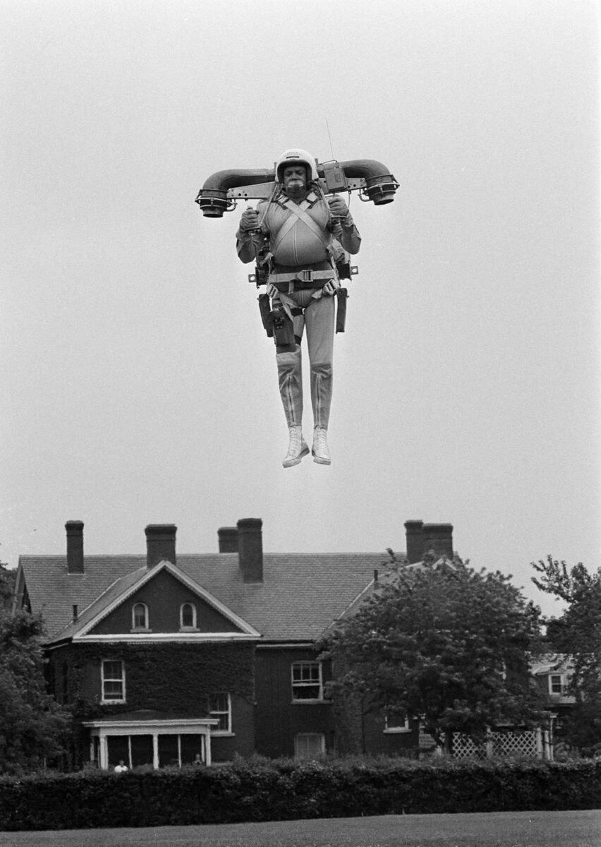 Реактивный ранец Роберта Кортера, испытания в Вашингтоне — 7 апреля 1969 Как он был устроен: - Лёгкий каркас из стеклопластика с двумя баллонами 90% перекиси водорода и баллоном азота (148 атм). - Азот выталкивает перекись в камеру, где поддерживается ~35 атм. - Перекись, проходя через серебряный катализатор, мгновенно разлагается на воду и кислород. - Перегретая смесь вылетает через два сопла — создаётся тяга. Несмотря на успешные тесты (более 250 полётов), в серию не пошёл — слишком сложно и дорого.