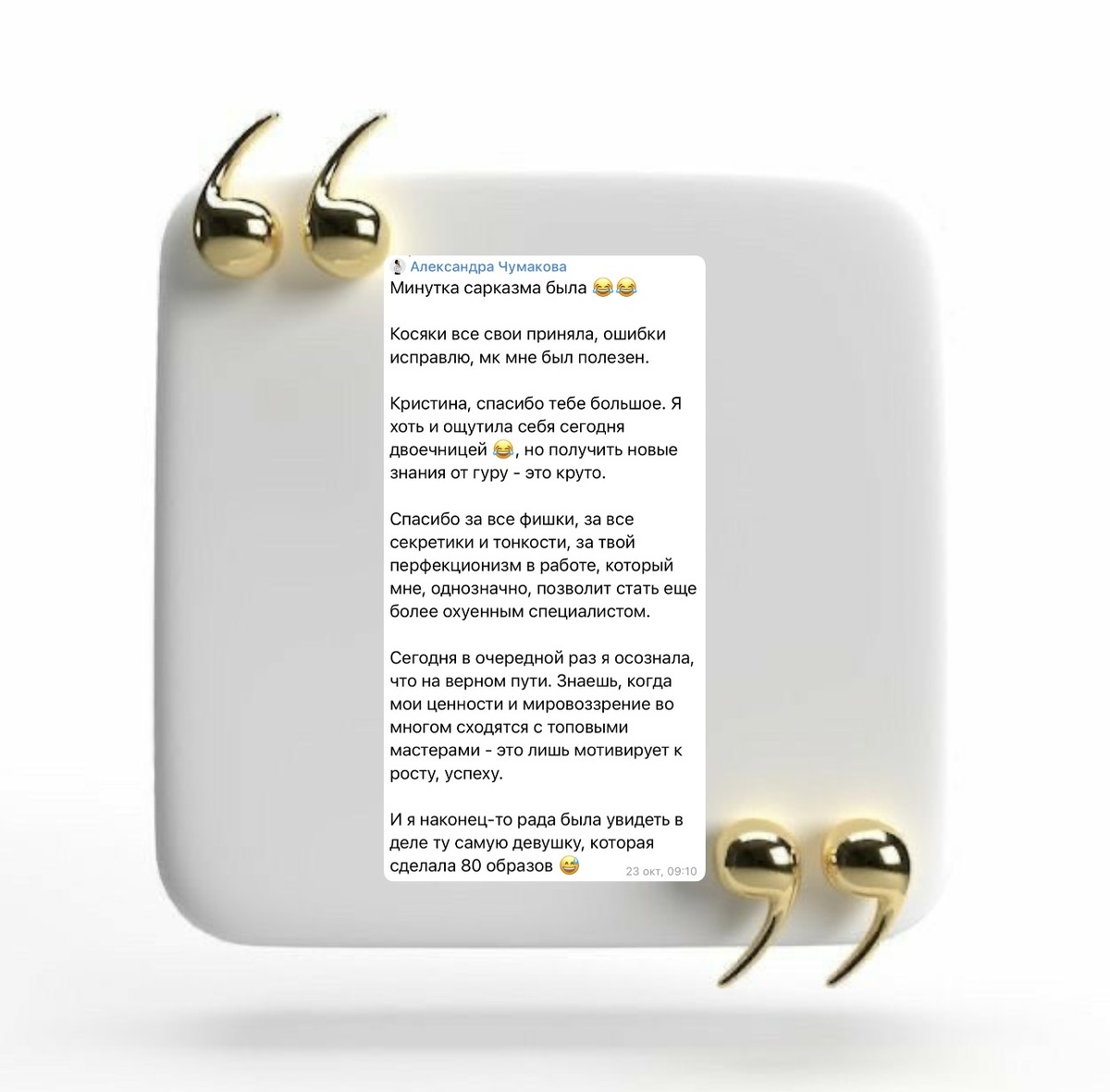 И я невероятно рада такой искренней обратной связи от участниц: Для меня, как для педагога, это очень ценно - это значит, что я делаю все правильно, и даю своим ученикам проверенные качественные знания. Моя цель — не удивить вас сложными терминами, а чтобы вы ПОНЯЛИ и СМОГЛИ повторить все сами. Я разбираю каждый шаг, показываю нюансы и делюсь лайфхаками, которые годами собирала на практике. После моих обучений все ученики: работы с кожей, тушевками, как сделать стойкий качественный макияж без эффекта маски